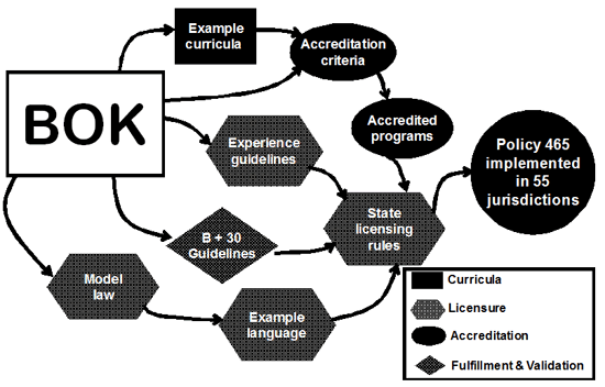 Engineers know how to plan—how to identify and link the steps needed to achieve an objective. Consistent with that tradition, Raise the Bar leaders developed a plan, part of which is shown below, to develop the BOK and use it to achieve the ultimate objective which is to implement ASCE Policy Statement 465 in 55 licensing jurisdictions.