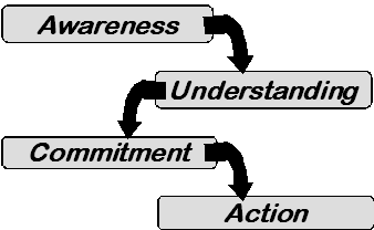 Consider a specific example of the awareness-understanding-commitment-action process. Awhile back, my wife said something like “let’s redecorate the interior of our house.” My knee-jerk reaction was no!—its fine for now—we just moved in—the living room furniture is not that old. I noted the three ominous D’s that were reasons for not making the suggested change. That is, we would have to deal with decisions, disruptions, and dollars. To encourage the second step, understanding, my wife reminded me that we had been on our house eight years and hadn’t done a thing. Furthermore, we brought the living room furniture with us and it was eight years old then. I understood! My wife was right and, therefore, I committed to the project. This lead to action; we painted, re-carpeted, and bought some furniture. As a result of the redecorating project, our home looks and lives great! In retrospect, I’m sure glad I proposed the change.