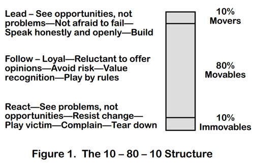 So you want to lead major change in your business, education, government, or volunteer organization. Then consider putting members of your organization or group into one of the three categories illustrated in Figure 1, that is, the movers, the movables, and the immovables (Walesh 2012).