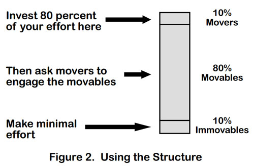 Consider another way of explaining the process by which you, the advocate of change, should focus first on movers and then, if successful, have them focus on the movables. Communicate the issue, the problem, or the opportunity to the movers and explain how the change you are advocating will resolve the issue, solve the problem, or seize the opportunity. We are tempted in situations like this, because of efficiency considerations, to go exclusively or mostly with mass communication such as e-mails, newsletters, memoranda, posters, banners, coffee mugs, key chains, and wallet-size cards. Don’t go with mass communication—other than as a supplemental measure. Mass communication is not an efficient use of your time and energy. Instead, go one-on-one and one-on-small groups and focus on that ten percent -- the movers (Smart 2007). Then you and the movers can engage the movables and effect change.